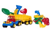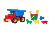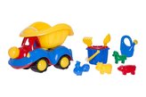 Samochód ptyś z dodatkami do piasku i konewka
