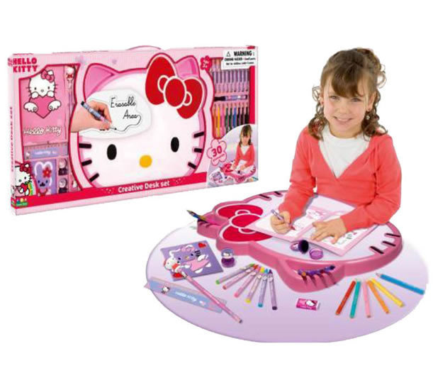 Sada obsahuje: podložku Hello Kitty o velikosti 42 x 34 cm, 30 různých doplňků - fixy, tužky, gumu, pravítko, tvořítko, sešit, razítko.