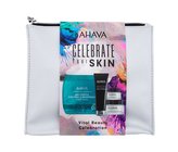 AHAVA Celebrate Your Skin denní pleťový krém Mineral Radiance Energizing Day Cream Broad Spectrum SPF15 50 ml + čisticí gel Mineral Radiance Cleansing Gel 100 ml + pleťová maska Mineral Radiance Instant Detox Mud Mask 100 ml + kosmetická taštička
