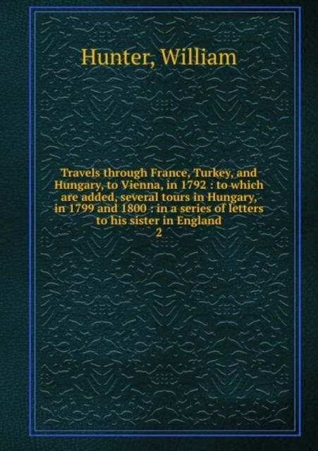 To which are added, several tours in Hungary, in 1799 and 1800: in a series of letters to his sister in England. Pages 27-28 is missing. This book, Travels through France, Turkey, and Hungary, to Vienna, in 1792. Volume 2, by William Hunter, is a replication of a book originally published...