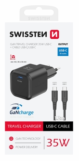 SWISSTEN SÍŤOVÝ ADAPTÉR GaN 1x USB-C 35W POWER DELIVERY ČERNÝ + DATOVÝ KABEL USB-C/USB-C 1,2 M ČERNÝ