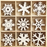 Dřevěné ozdoby v boxu 45ks - vločky - 9 motivů po 5 ks, rozměr motivu: 3x3cm.