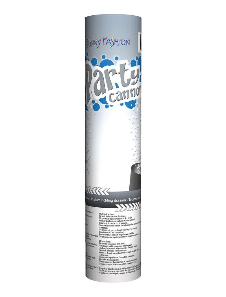 Stříbrné obdélníkové konfety z metalické folie v kartonovém 20 cm tubusu, vystřelované stlačeným vzduchem pootočením spodní části tubusu ve směru šipek. Nemiřte na lidi. Dodržujte bezpečnou vzdálenost 5 m. Vhodné pro použití v exteriéru i interiéru.