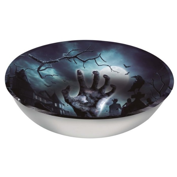 Plastová miska hřbitov - 27 x 9 cm. Plastová miska se strašidelným potiskem hřbitova budou nepostradatelným doplňkem každé Halloweenské party, tématické party nebo strašidelné party. Jsou také velmi praktické, misky po použití jednoduše umyjete a můžete jej znovu použít.