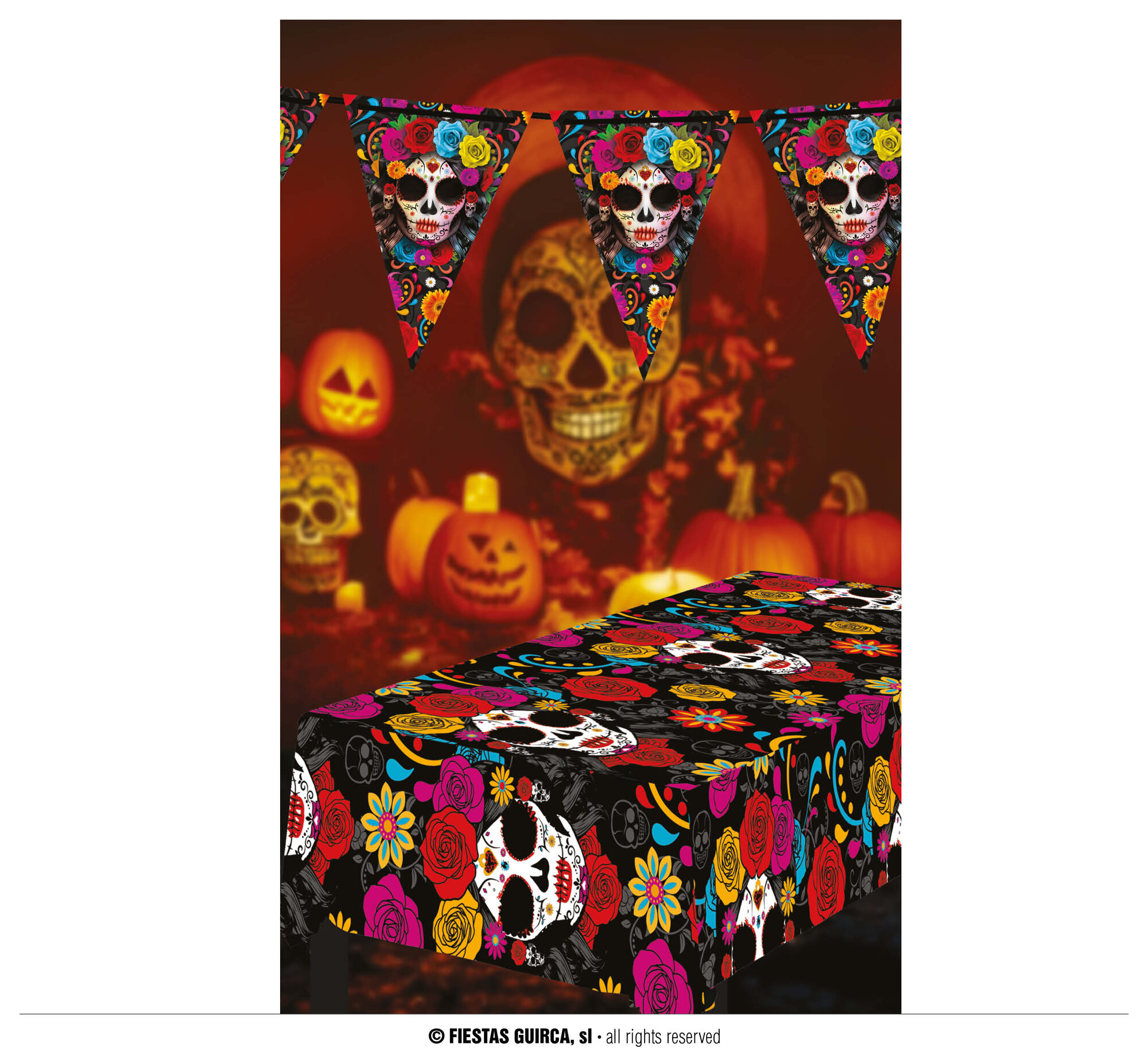 Halloweenský ubrus Day of the dead - 173 x 274 cm. Halloweenský party ubrus, s motivem Dia de los Muertos. Ubrus je po celém obvodu potištěný. Určitě ozvláštní vaši dekoraci Halloweenské oslavy.  173 x 243 cm Balení: 1 ks. prečítať celé