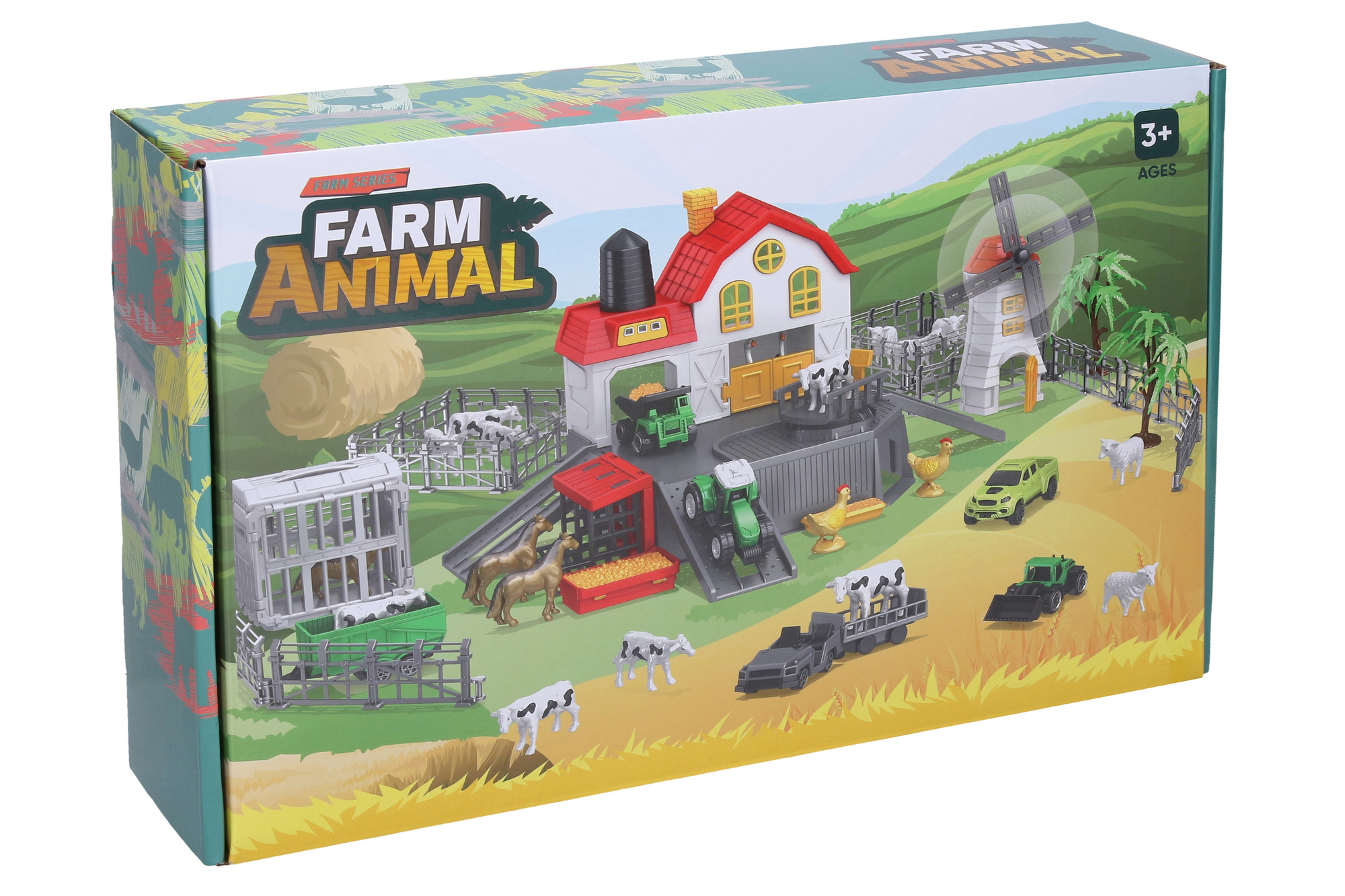 Farma se zvířátky. Součástí vše z obrázků na obalu - farma, mlýn, traktor s vlečkou, sklápěč, nakladač, přepravní vozidlo, ohrada, stromy, figurky zvířátek (koně, slepice, ovce, kozy, pes). Obrázkový návod na složení na zadní straně obalu. prečítať celé