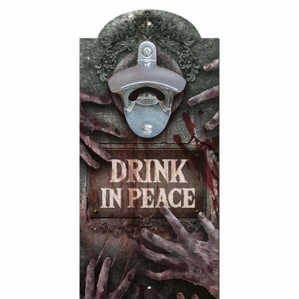 Nástěnný otvírák lahví - hřbitov 30 cm. Nástěnná table s mechanizmem na otevírání lahví a s odhazovací krabičkou, se strašidelným potiskem hřbitova a nápisem Drink in Piece budou nepostradatelným doplňkem každé Halloweenské party, tématické party nebo strašidelné party.
