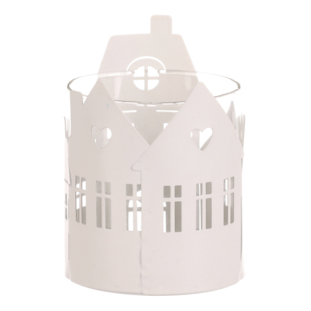 Kovový svícen s domečky po obvodu je dokonalou doplňkovou dekorací pro váš vánoční interiér. Jeho bílá barva přináší do prostoru zimní nádech s puncem historie, zatímco detaily domečků dodávají dekoraci na jedinečnosti. Skleněná miska uvnitř svícnu poskytuje ochranný prostor pro umístění čajové nebo LED svíčky, která bude vyzařovat nádherné světlo skrze všechna okénka a dvířka. Bílá barva vytváří příjemnou atmosféru, která zvýrazní kouzlo vánočního období.