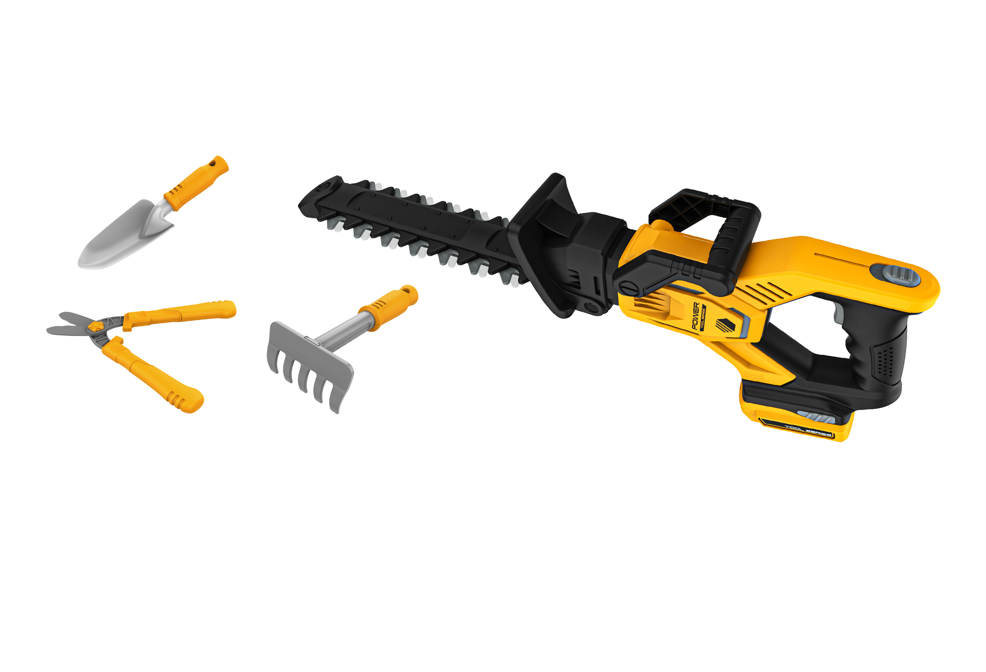 Nůžky na živý plot s příslušenstvím. Rozměry 58x8,5x20 cm.Obsahuje: nůžky na živý plot, zahradní nůžky, hrábě, lopatka. Zvukové a světelné efekty. 3xAA baterie nejsou součástí. Přepínač ON/OFF v rukojeti. Přepínač normálního a zpětného chodu nad rukojetí. Simulace odpojení bateriového modulu.