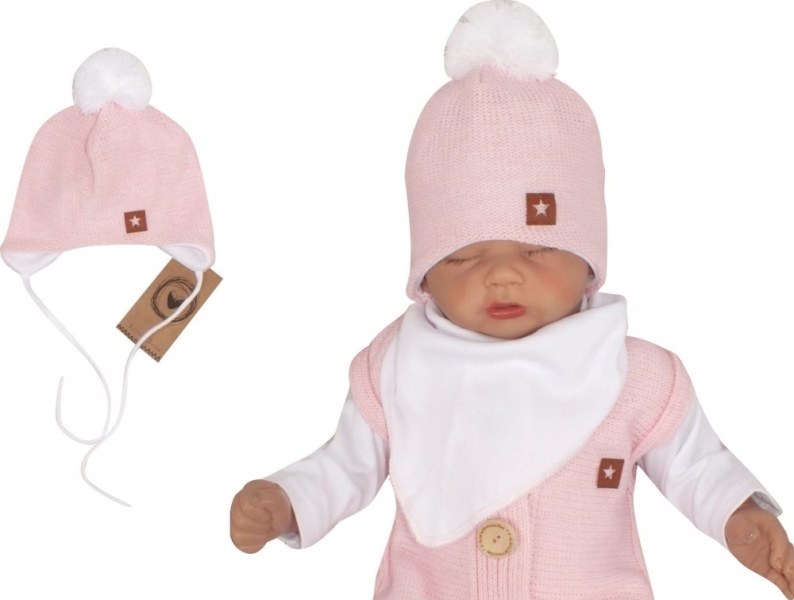 Z&Z Dvouvrstvá pletená čepice na zavazování s bambulí, růžová, vel. 68; 68 (3-6m)