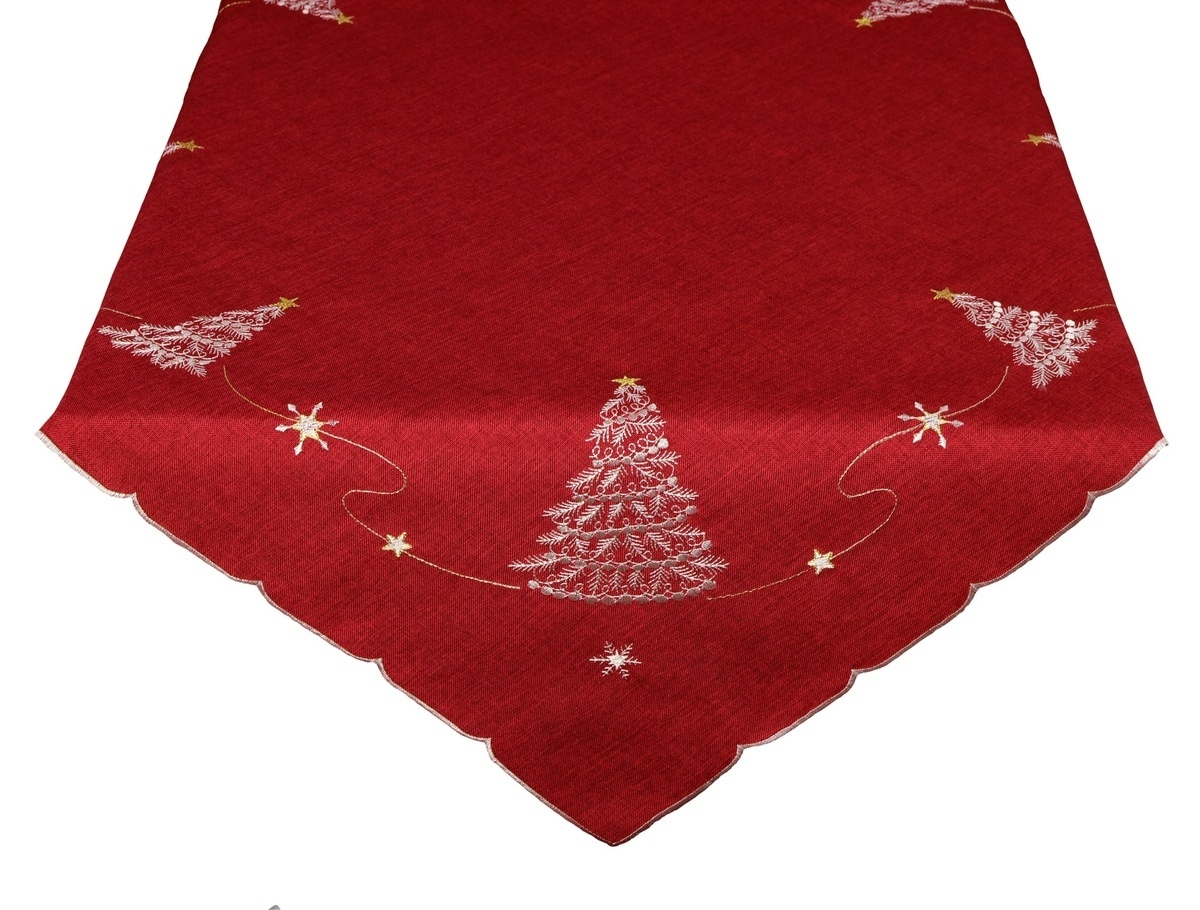 Elegantní dekorační ubrus pro Vánoční pohodu a krásně prostřený stůl je vyrobenz příjemné látky vysoké gramáže. Nádherný lehce lesklý vzor stromečku v pastelověbílé barvě je olemovaný drobným bílozlatým řetízkem s hvězdičkami a vločkami.Příjemný vzor krásně vyniká na elegantní červeněbordové...