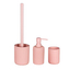 Koupelnový set z polymerové pryskyřice v trendových barvách a vzorech. Sestava se skládá z kalíšku na zubní kartáček, dávkovače na mýdlo a toaletní štětky.