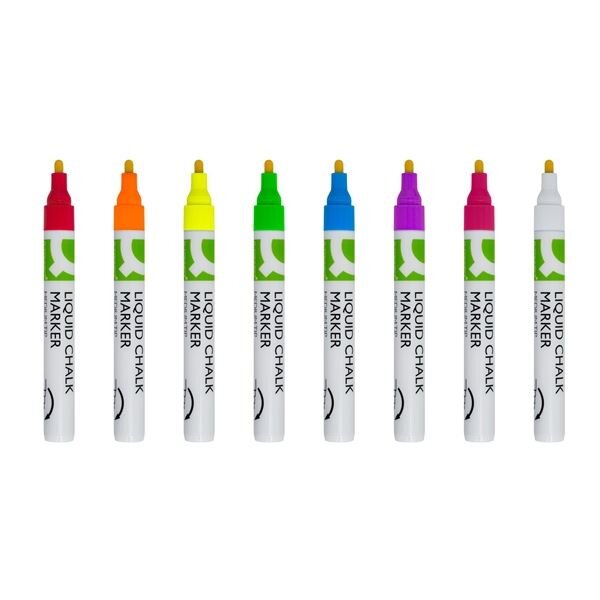 Tekuté křídové popisovače Q-Connect, sada 8 barev;Ideální pro psaní na jakoukoli základní tabuli, sklo nebo jiný neporézní povrch (dlaždice, bílá tabule, plast, kov);Popisovač má dvojitý hrot (kulatý i zkosený);Průměr hrotu: 4,25 mm;8 různých barev: bílá - růžová - fialová - modrá - zelená -...