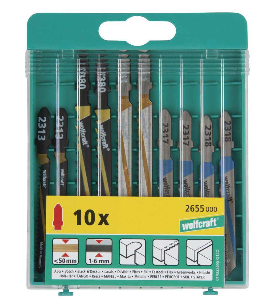 WOLFCRAFT - pilové plátky - 10 ks v plastovém boxu vysoká životnost materiál: 1/ měkké dřevo, dřevotřískové desky, laťovky, plasty 2/ tvrdé dřevo, překližky, MDF, dřevotřískové desky s plastovým povrchem 3/ měkké dřevo, dřevotřískové desky, MDF, laminát, plasty 4/ plechy, hliník 5/...