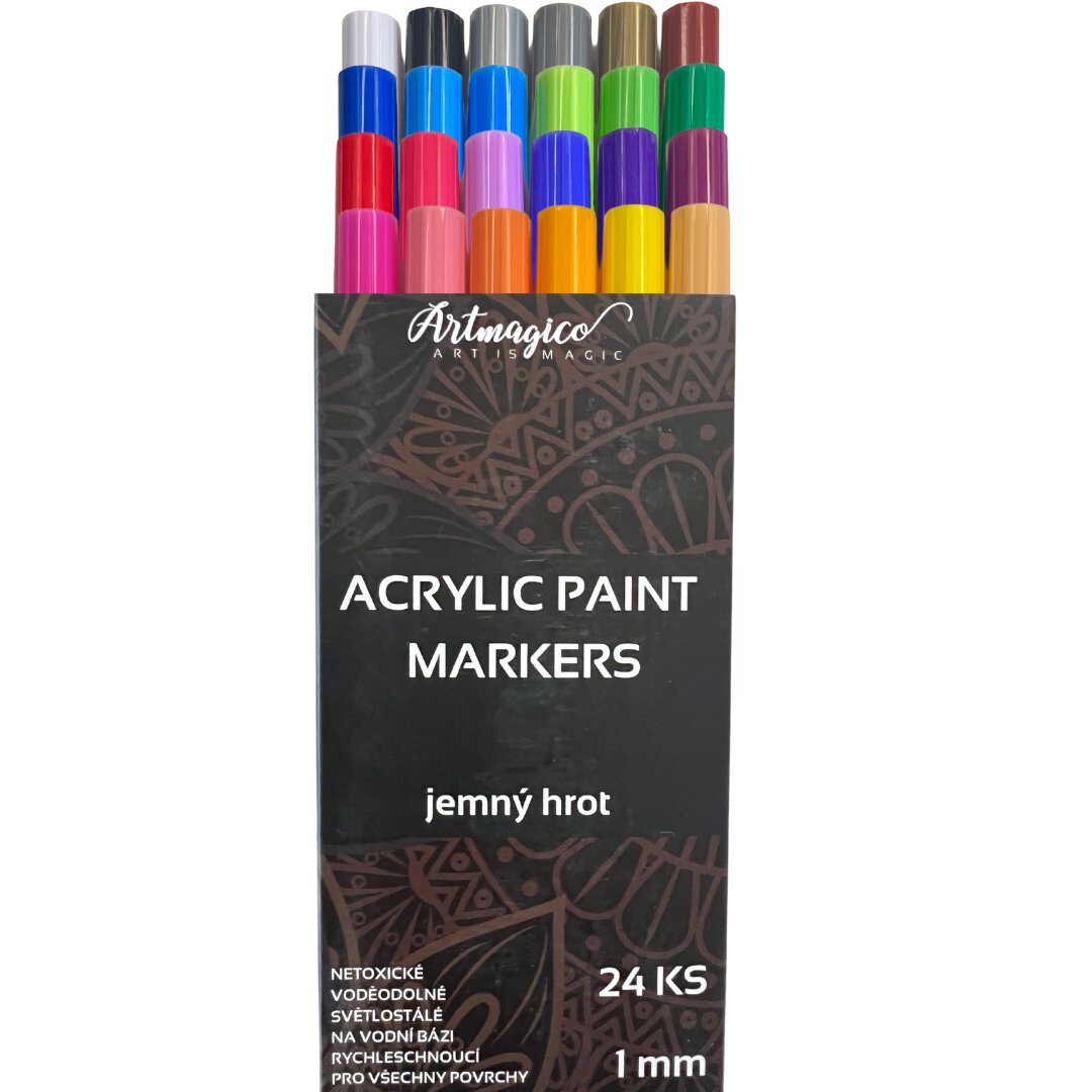 Akrylové fixy v sadě 24 kusů s jemným hrotem o šíři linky 1 mm v prémiové kvalitě. Perfektní inkoust se skvělými krycími vlastnostmi vhodný pro všechny typy malby a kreativní tvorby. Díky hrotu z porézního vlákna je použitelný na všechny povrchy a při práci neodstřikuje ani méně zdatnému malíři.