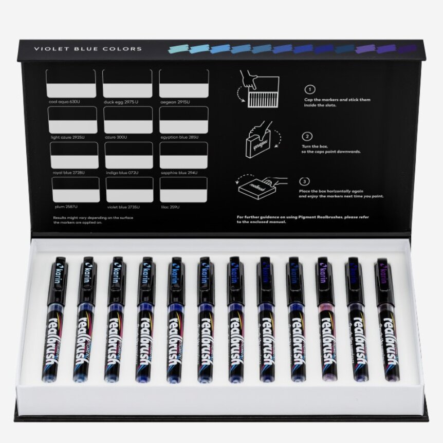 Objevte umělecký svět s Karin REAL BRUSH PIGMENT s 12 pigmentovnaými barvami! Tento set nabízí 12 barev v fialovo-modrých odstínech s vysoce koncentrovanými pigmenty a flexibilními štětečkovými hroty, ideální pro profesionální i amatérské umělce. Vytvářejte detailní kresby, jemné přechody a syté barvy s tímto kvalitním nástrojem.