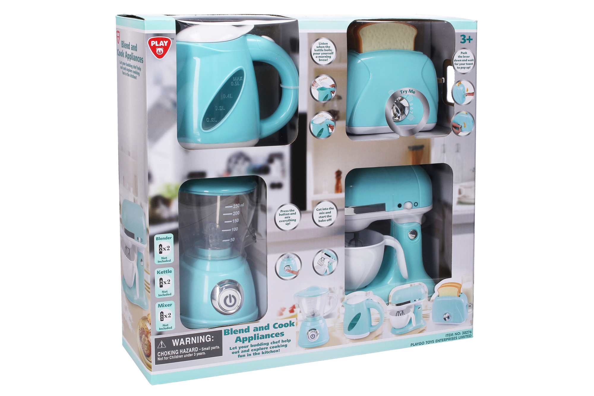 Playgo kuchyňské spotřebiče set 4ks. Obsahuje: varnou konvici, topinkovač, mixér a kuchyňský robot. Topinkovač po zatlačení páčky dolů a nastavení kolečka začne tikat a po uplynutí času topinky vyskočí. Mixér při držení stlačeného tlačítka mixuje. Kuchyňský robot po zapnutí tlačítka mixuje, po vypnutí se zastaví. Konvice vydává zvuk vařící se vody. Baterie 2xAAA, 4xAA nejsou součástí.