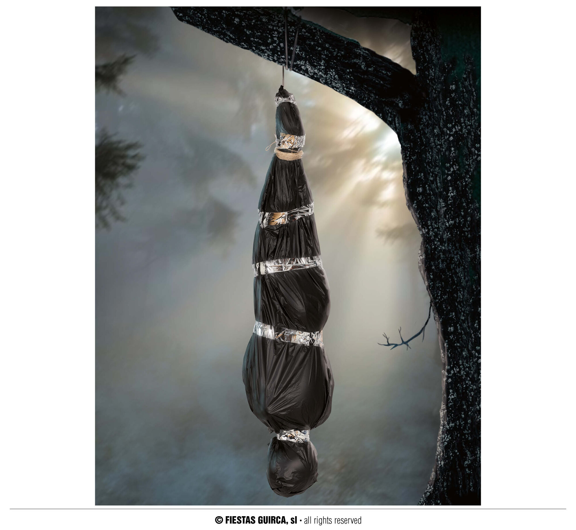 Halloweenská dekorace - mrtvola v pytli 178 cm. Strašidelná dekorace v podobě mrtvoly zabalené do igelitu. Hodí se na Halloweenský večer nebo hororovou party. Krásný doplněk na každé Halloweenské party, nebo tématické party.