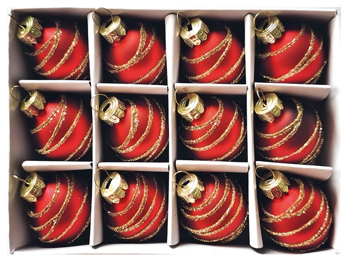 Krabička obsahuje 12 kusů červených baněk s glitrovým dekorem.