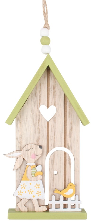 Dřevěný domeček se zajíčkem zelený na zavěšení 16 cm