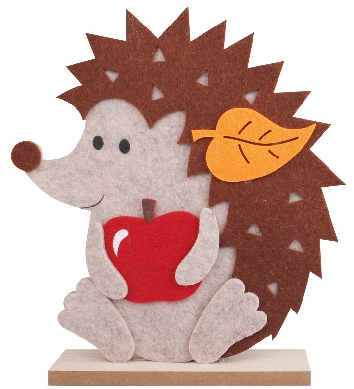 Ježek z filcu s oranžovým lístkem na postavení 20,5 x 23 cm