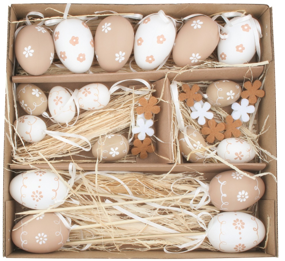 Sada vajíček (6 cm) 6ks, (4 cm) 8ks na zavěšení+ (6 cm) 4ks zápich+ 9 ks kytičky