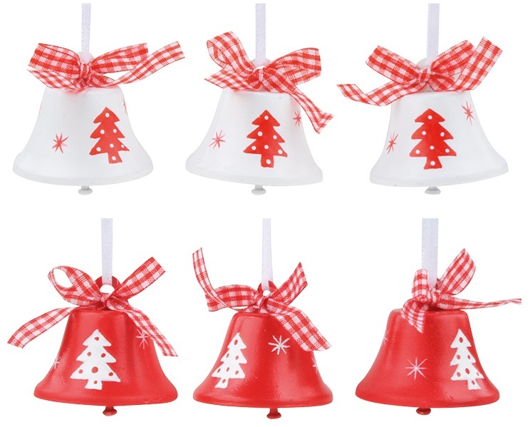 Zvonky na zavěšení červenobílé se stromečkem 4,5 cm, 6 ks