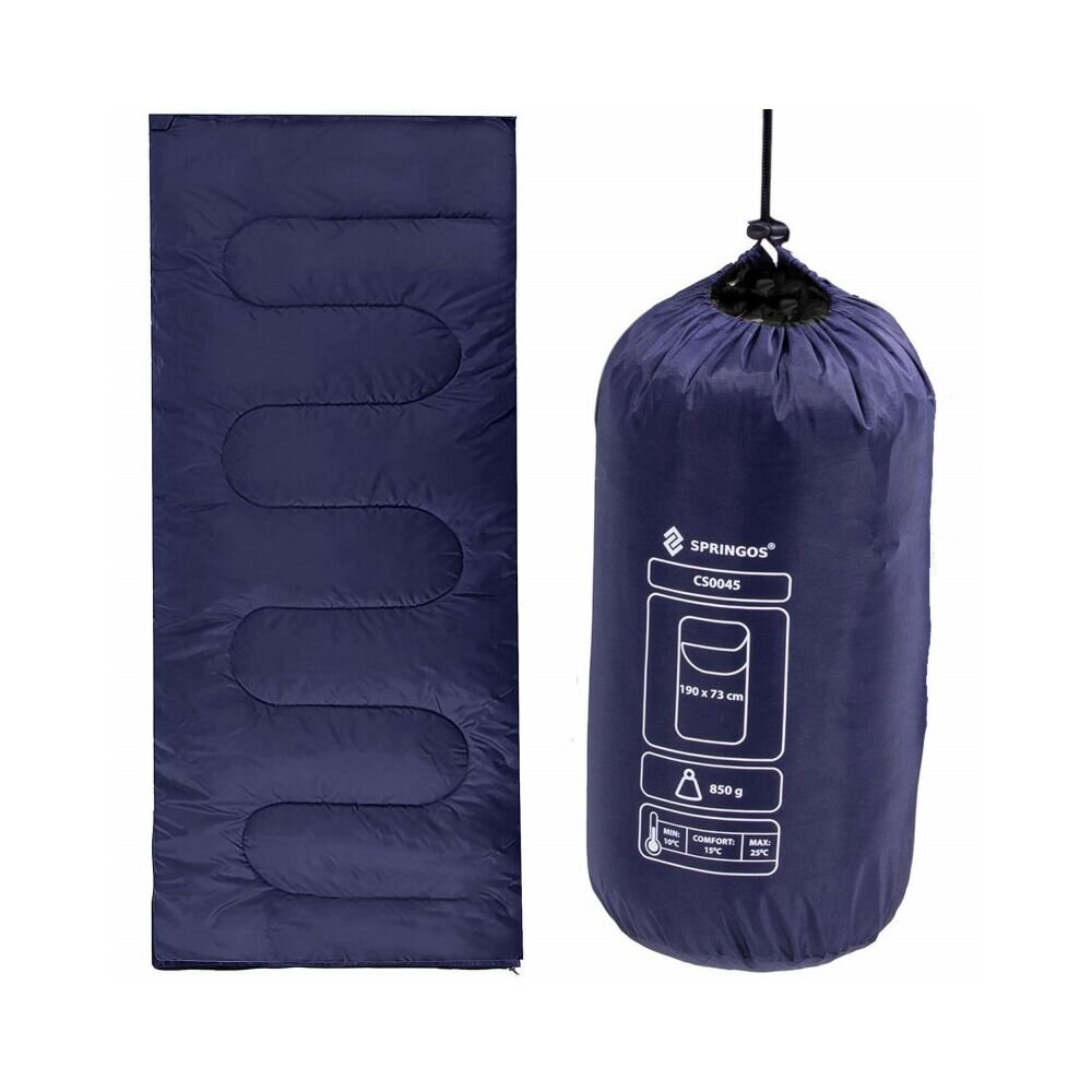 Kempingový spací pytel s rozměry 190x73 cm. Syntetická antialergická výplň, membrána z dutých vláken. Kapuce se stahovací šňůrkou, prošívání, nízká hmotnost. Snadná přeprava, voděodolné vlastnosti, madla na sušení. Ideální doplněk při kempování, na tábor nebo během výletu v horách.