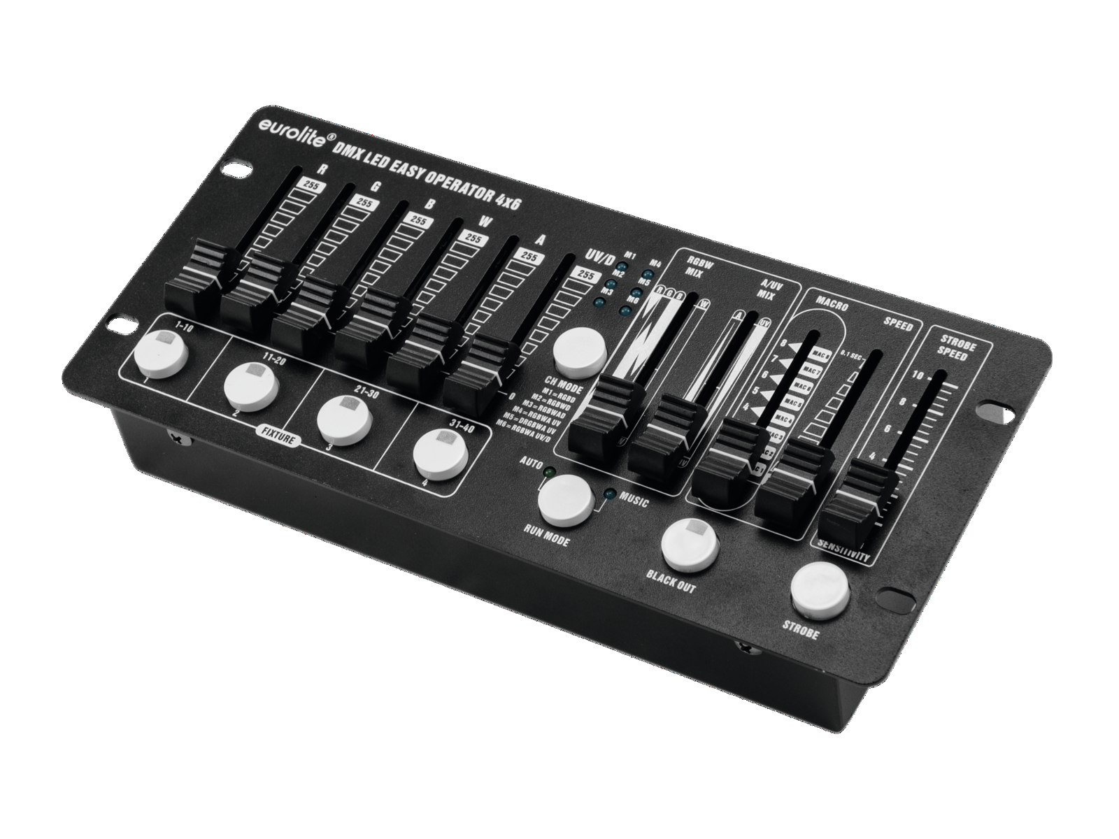 Praktický a kompaktní DMX ovladač pro LED reflektory. Snadné ovládání 4 reflektorů s RGBAW+UV LED diodami, které lze ovládat společně nebo individuálně. Oddělené řídící kanály pro jednotlivé barvy (červená, zelená, modrá, oranžová, bílá a UV) a master. Různé režimy pro volbu barevné sekvence...