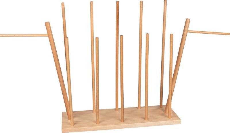 Statyw Goki wykonano z drewna. Został on wyposażony w 12 palików do nakładania na nie pacynek na rękę lub palce.