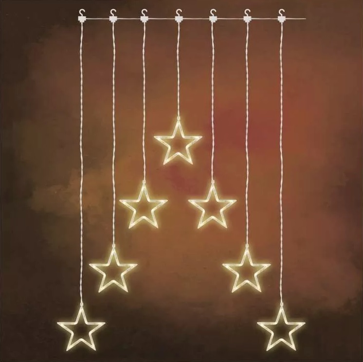 Závěs hvězdy 115 LED vhodné do interiéru i exteriéru, na zavěšení norma IP44 počet hvězd: 7 počet LED: 10 barva světla: teplá bílá rozměr: 67 x 125 cm + 5 m přívodní kabel typ napájení: 230 V barva drátu: stříbrná prečítať celé