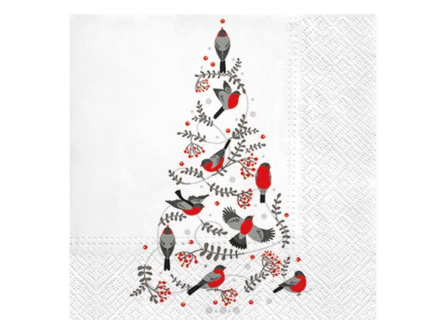 Papírový vánoční ubrousek s motivem stromečku, který je tvořen větvičkami a sedícími ptáčky. Je vyroben z velmi kvalitního třívrstvého papíru. Tento ubrousek je ideální pro zimní či vánoční stolování, jeho jednoduchý a vkusný design se hodí jak pro slavnostní večeře, tak pro běžné příležitosti během svátků.