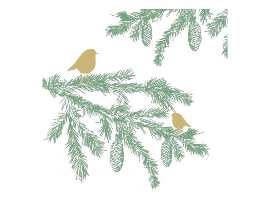Papírový vánoční ubrousek. Ubrousek je kvalitní z třívrstvého papíru s motivem větviček s šiškami a ptáčky. Vytvořeni decentní vánoční atmosféry stojí na maličkostech. I taková drobnost, jako vánoční ubrousky změní ráz vašeho stolování.