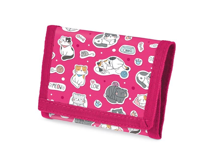 Dětská textilní peněženka v růžové barvě s motivem koček a zapínáním na suchý zip. Peněženka má přihrádku na bankovky, mince, kapsičku vhodnou například na jízdenky a také kapsičku s průhledným okýnkem o velikosti kreditní karty.Peněženka má kovový kroužek na klíče a praktickou šňůrku pro...