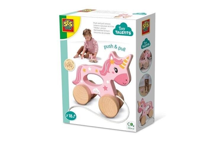 Piękny różowy jednorożec do ciągnięcia, wykonany z drewna i wyposażony w solidne koła do zabawy. Pchnij jednorożca, wykorzystując otwór jako uchwyt lub pociągnij za sznurek, aby jednorożec jechał z tyłu. Nowoczesny i uroczy wzór jednorożca, rozmiar dostosowany do dziecięcych dłoni.