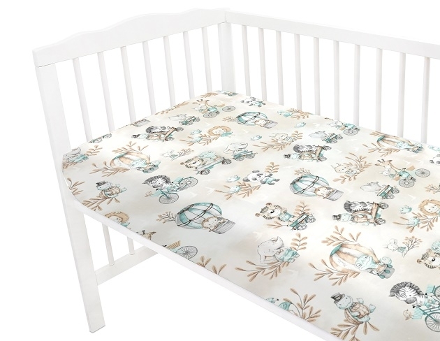 Dětské bavlněné prostěradlo do postýlky, ZOO na cestách - mátová/cappuccino; 120x60
