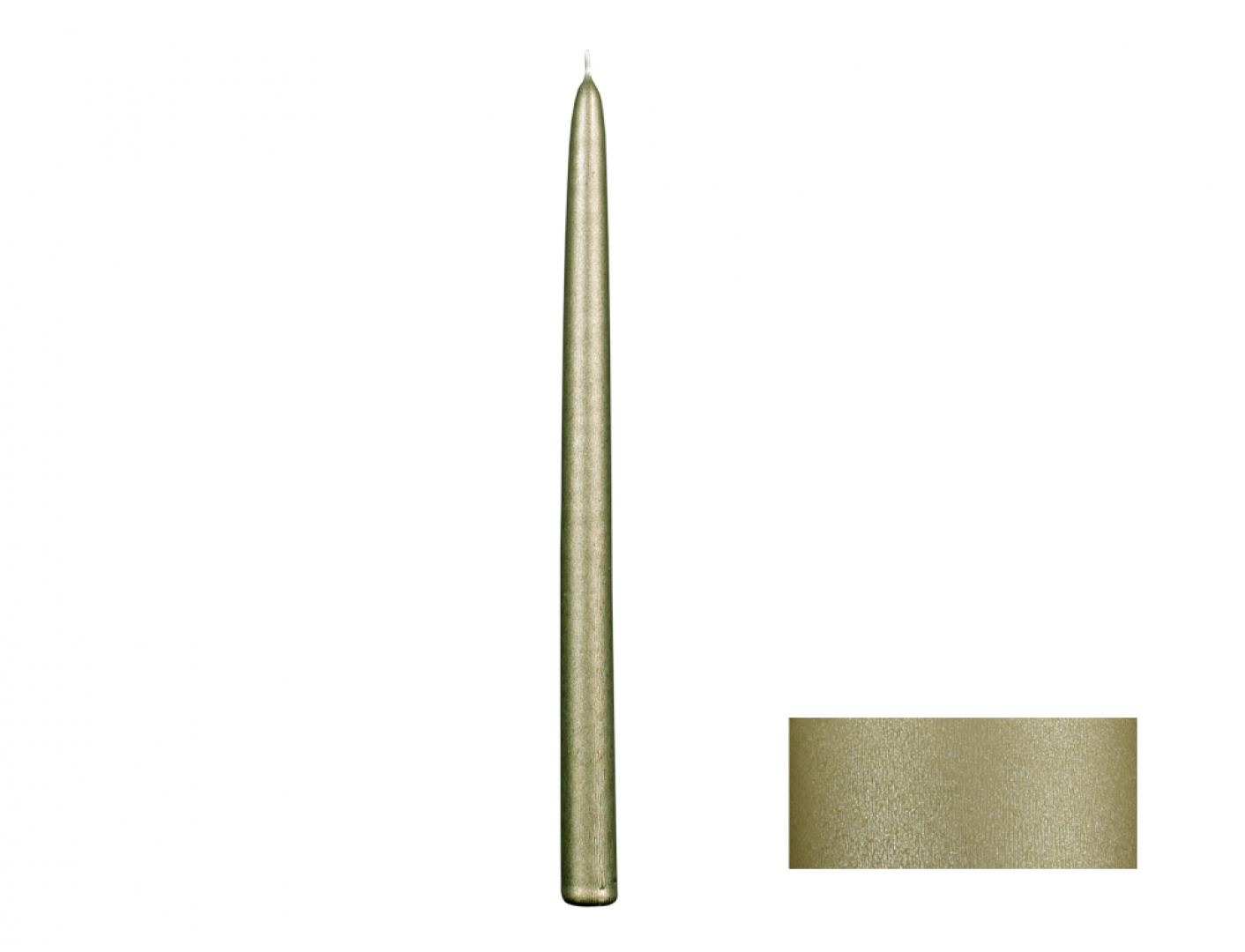 Stolní svíčka kónického tvaru. Její povrch je zdobený jemným škrábáním. Má prémiový vzhled, který pozdvihne každou dekoraci či vazbu. Doba hoření: 8 hodin. Rozměry: spodní průměr 2 cm, výška 29 cm. Barva: chromová zlatá. prečítať celé