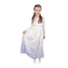 Dlhé biele šaty sú v hornej časti zdobené nádhernými flitrami, ktoré pridávajú šatám elegantný trblietavý efekt. Sukňa je tvorená ľahkým bielym a fialovým tylovým materiálom, ktorý je jemne zdobený potlačou, čo dodáva kostýmu rozprávkový vzhľad. Súčasťou šiat je aj vlajok dekorovaný flitrami, ktorý umocňuje dojem kráľovského outfitu.