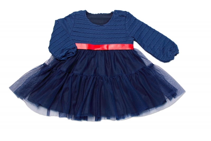 Rozšířený střih a elegantní látka. Dvouvrstvý top; svršek je z mačkaného bavlněného materiálu s hladkou bavlněnou podšívkou. Na straně ramene je zapínání na cvočky, rukávy zakončené volnou gumičkou. Námořnická modrá/granátová bavlněná sukně s našitými tylovými volány. Červená vsadka s mašlí...