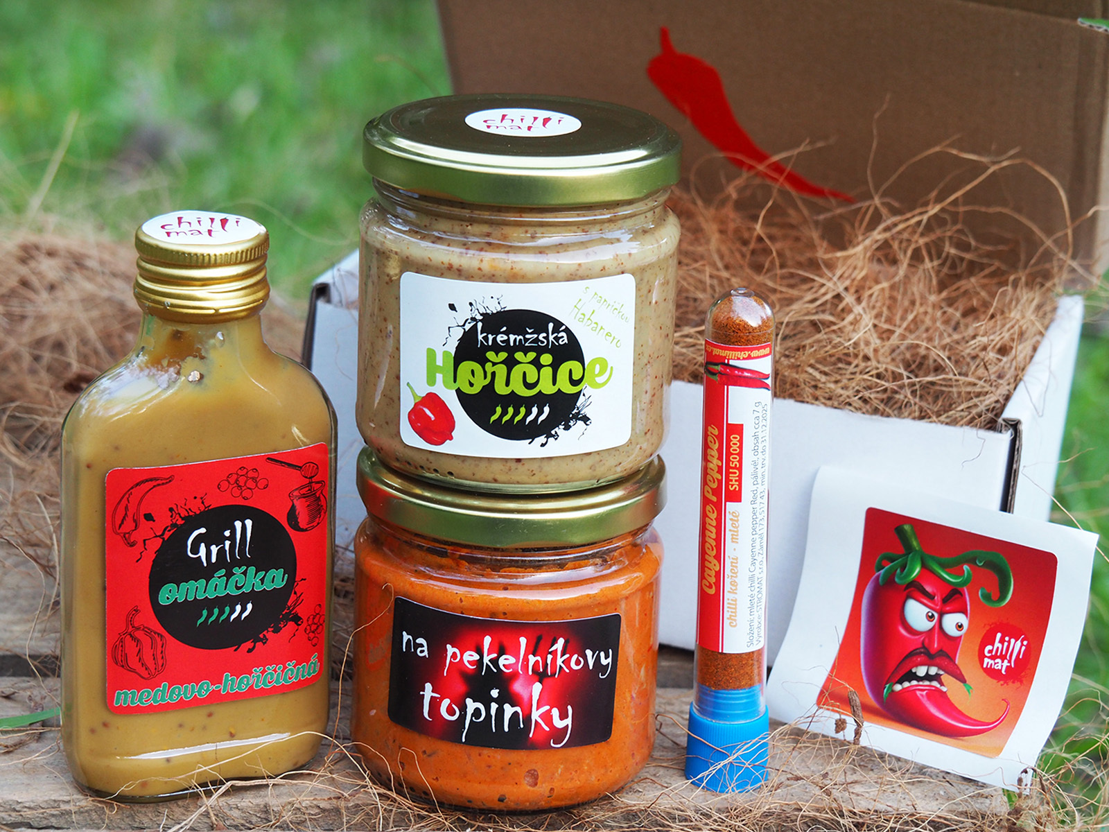 Aby sme podporili vašu kreativitu v kuchyni, pridali sme tiež mletý kajenský čier, ktorý využijete v marinádach, omáčkach, polievkach i na pizzu či tacos. Každá súčasť tohto balenia je naším vlastným výrobkom, pripraveným s láskou a zabaleným v krásnej darčekovej škatuľke vyplnenej prírodným kokosovým vláknom. Súčasťou je aj štýlová nálepka s motívom chilli, ktorá poteší obdarovaného.