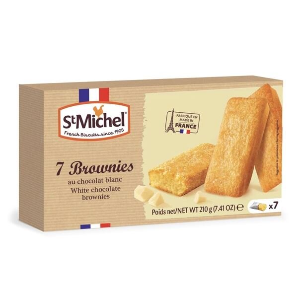 Brownies St. Michel - bílá čokoláda, 210 g;Jemné pečivo s delikátní chutí a texturou s použitím lokálně vyprodukovaných surovin bez umělých barviv a dochucovadel;Ideální doplněk ke kávě nebo jako snídaně pro celou rodinu;Balení obsahuje 7 jednotlivě zabalených kusů;Hmotnost 210 g