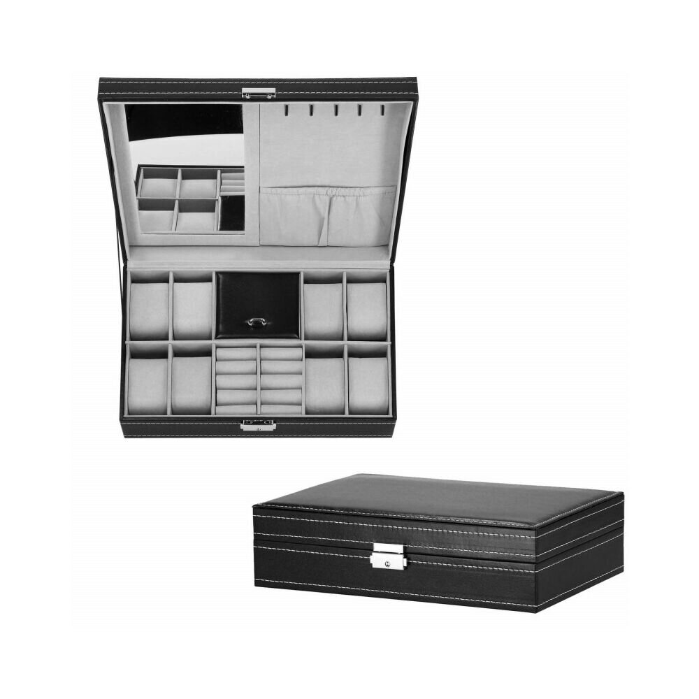 Ideálním a stále populárnějším řešením na odkládání cenností jsou organizéry určené na hodinky, doplňky a šperky. Vyrobeno s důrazem na ty nejmenší detaily. Elegantní a praktické, kovové zavírání. Organizér v podobě masivní krabičky, uvnitř je extrémně měkká a na dotek jemná velurová látková podšívka. Rozměry pouzdra jsou 33 x 20 x 9 cm.