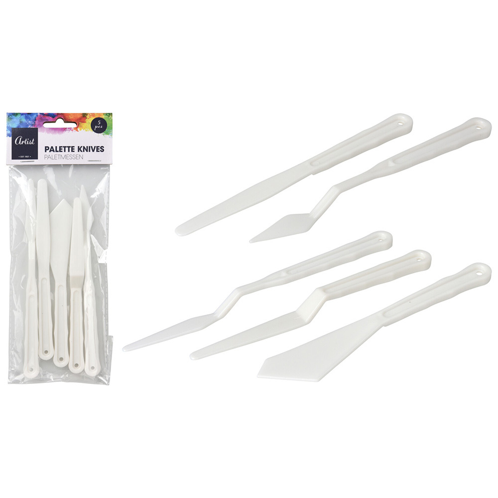 5 dílná plastová souprava paletových špachtlí ideální pro začínající umělce.Díky provedení z pevné ale pružné umělé hmoty jsou tyto špachtle bezpečnější pro použití než kovové nože, snadno se udržují a jsou odolné proti znečištění.Ideální pro nanášení masy akrylových a olejových barev.