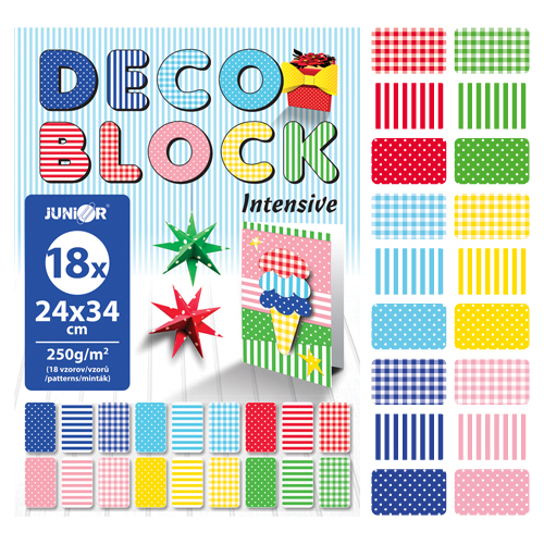 Složka dekoračního papíru - výkres DECO BLOCK B4 dobře poslouží pro vaši kreativní tvorbu.blok obsahuje 18 listů / 18 různých vzorů (viz obrázek)intenzivní, jasné barvyjednostranný potiskplošná hmotnost papíru: 250g / m2tvrdý karton na zadní straně složkyvyužijete k výrobě dekorací, olepení...