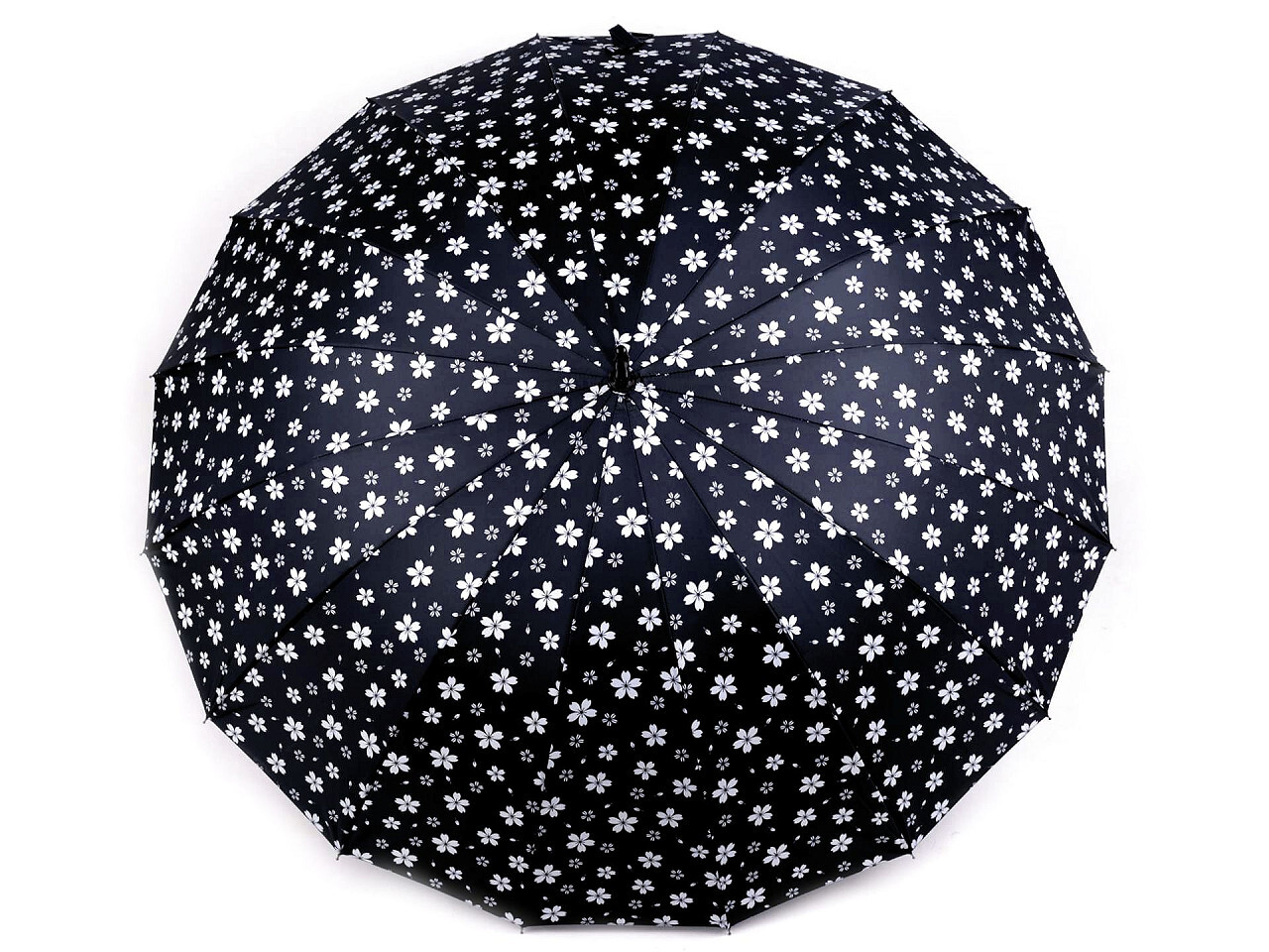 Dámský vystřelovací deštník s malými květy vás spolehlivě ochrání před nepřízní počasí. Skládá se z 16 výsečí, díky kterým se deštník řadí mezi luxusní kousky. Konstrukce je vyrobená z kovových drátů a pružných lamel zajišťujících vysokou pevnost a stabilitu, deštník se neohne ani za největšího nečasu. Má klasickou tyč zakončenou pevnou rukojetí.