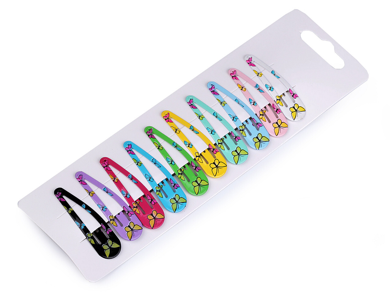 Mix barevných sponek s potiskem ocení všechny malé parádnice. Jsou vyrobené z kvalitního materiálu, který dlouho drží svůj tvar, funkčnost i barvy. Sponky jsou umístěné na papírové kartě s výsekem pro zavěšení a vystavení sponek.