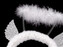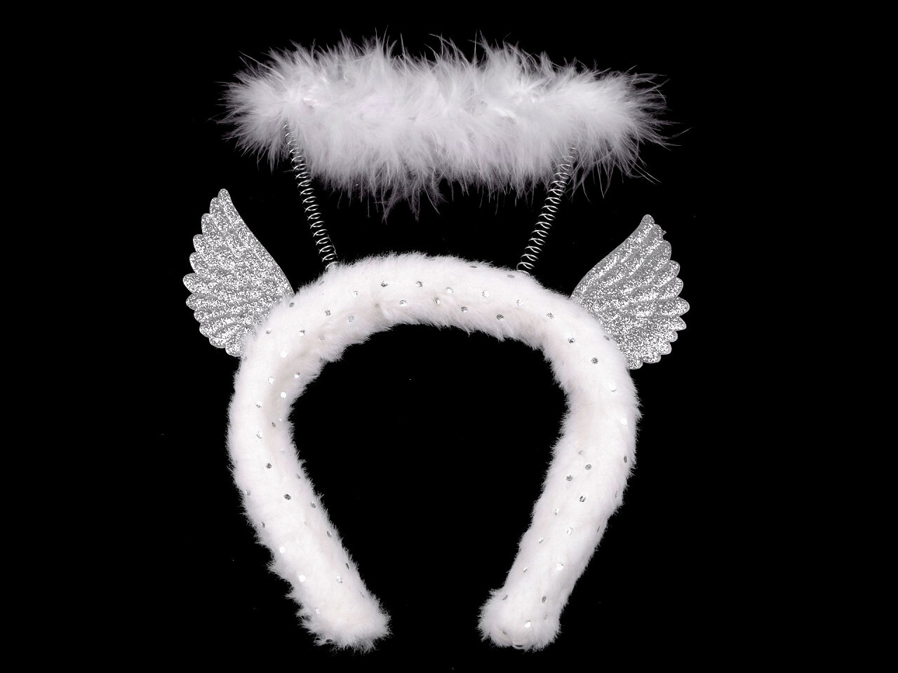 Karnevalová čelenka se svatozáří doladí každý andělský kostým. Péřová svatozář není kulatá, jelikož její součástí není drátek, který by držel kulatý tvar. K čelence je připevněná pomocí kovových pružinek.
