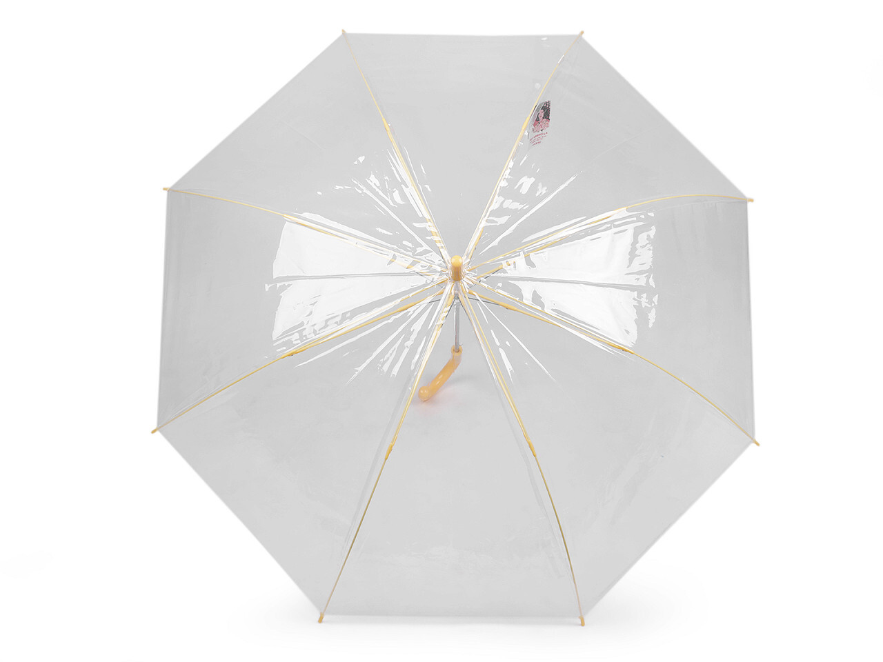 Dámský průhledný deštník s barevnou konstrukcí je vyrobený z pevného materiálu. Jeho průhledný design umožňuje lepší výhled, bez omezující clony deštníku. Deštník je vystřelovací, má klasickou tyč zakončenou pevnou rukojetí. Konstrukce deštníku je z ohebných plastových lamel a tvoří osm polí....