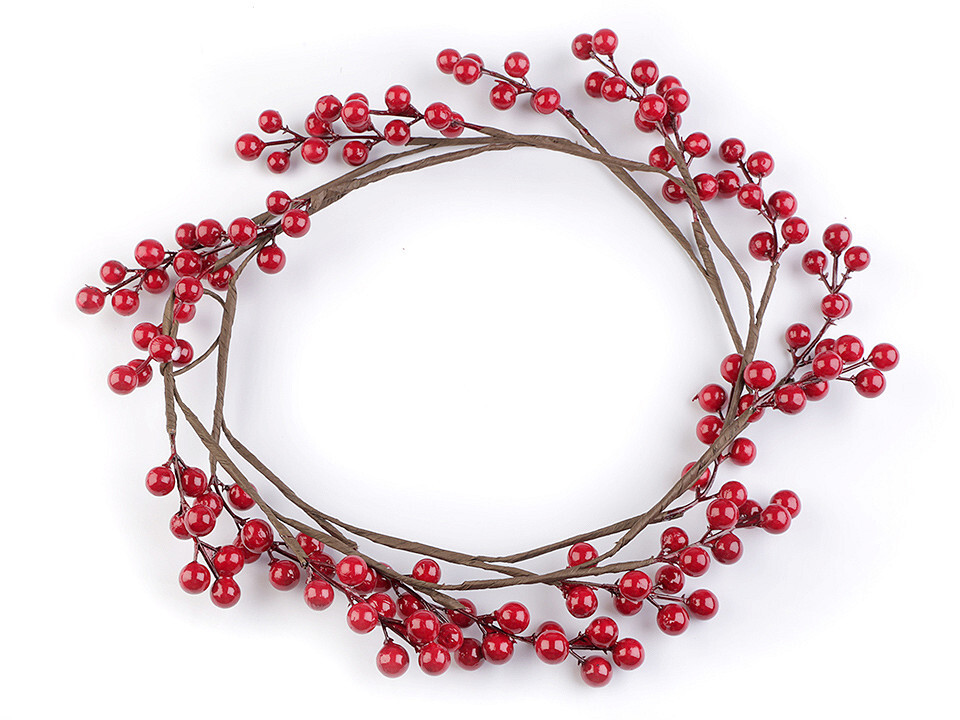 Dekorační jeřabiny z polystyrenu jsou připevněny na plastovou větvičku. Jednotlivé trsy jsou upevněny na drát, který je 150 cm dlouhý. Větvička se dá lehce tvarovat a upravit do pozice, jakou budete chtít.