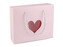 Papírová krabice s průhledem srdce má ucha z lesklé kroucené šňůry. Slouží jako taška s uzavíráním, bez uch ji můžete použít jako klasickou dárkovou krabici. Výřez srdce je zespodu podlepený průhlednou fólií. Krabici využijete na balení dárků, šátků, kosmetiky apod.
